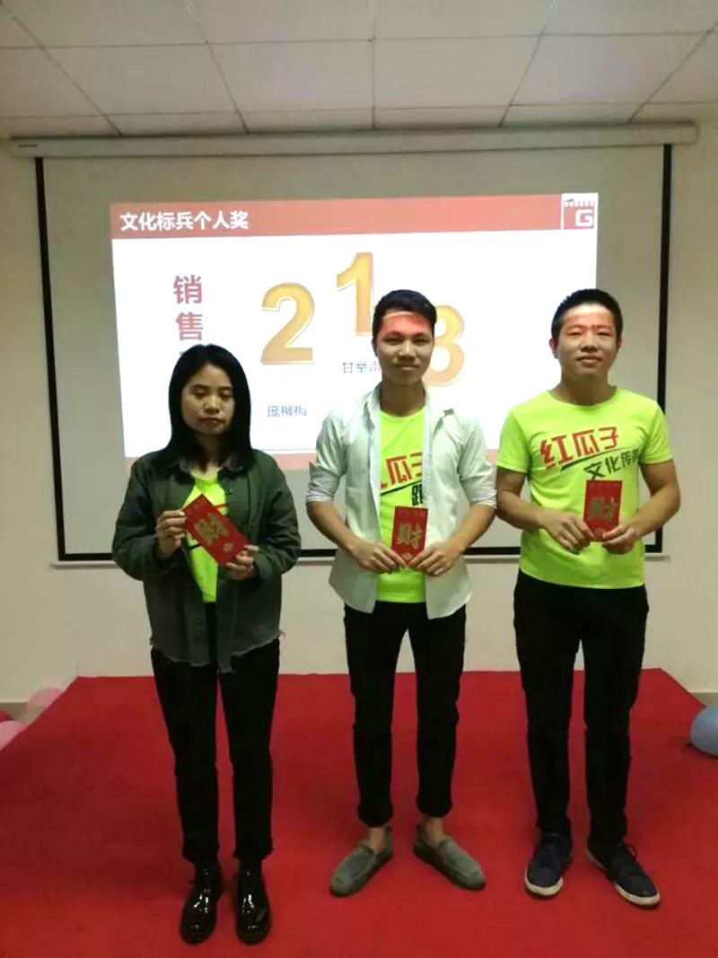 紅瓜子這是一個可以真正鍛煉一個人的平臺,它不但有各種獎項,這里還可以學(xué)習(xí)到非常多的理論知識,我的改變是從文化標(biāo)兵這個點出發(fā)的,文化標(biāo)兵獎雖然剛剛設(shè)立沒有多久,但起到的作用是巨大無比的。通過文化標(biāo)兵的評比,對內(nèi)可以提高同事的理論知識掌握,對外可以起到宣傳企業(yè)品牌的好處,董事長做文化標(biāo)兵評比這個決定真的是太正確了。