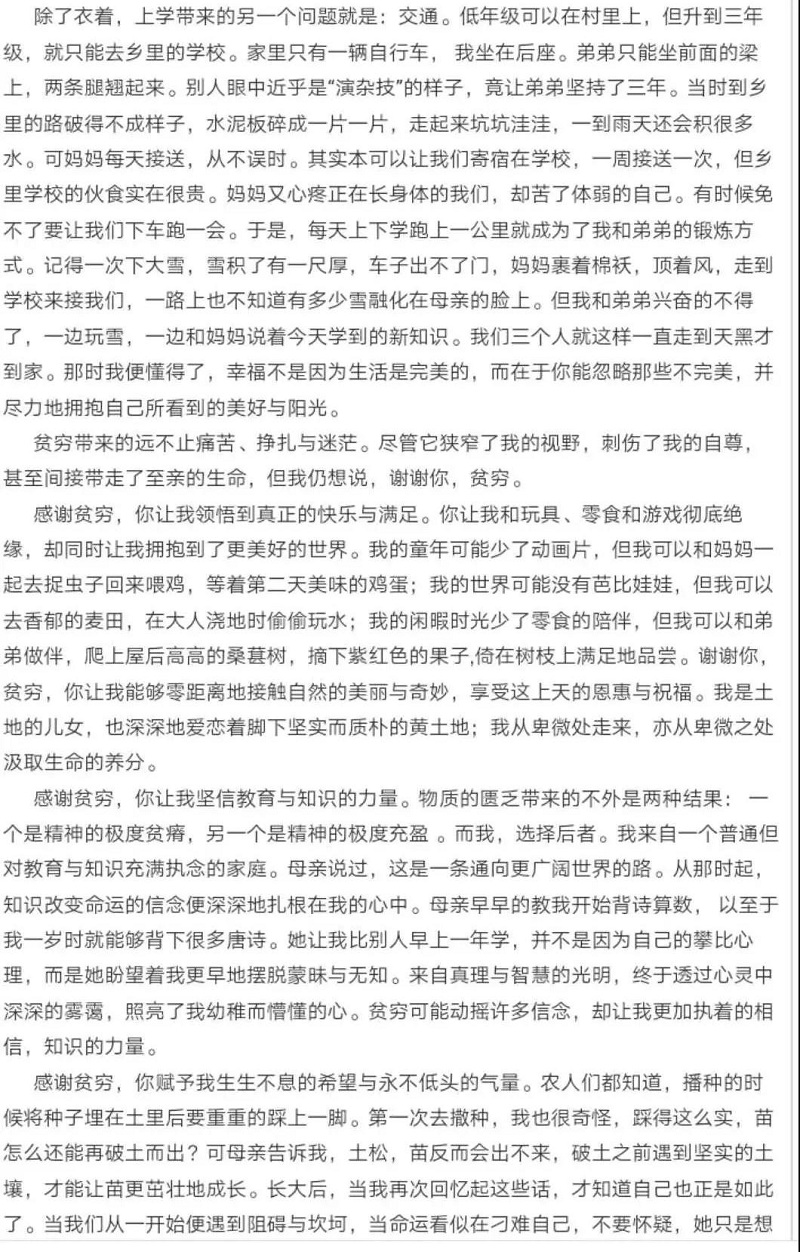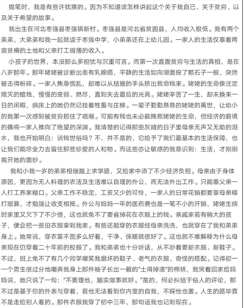王心儀此前寫的一篇關(guān)于自己、關(guān)于貧窮、關(guān)于希望的文章,一經(jīng)發(fā)出以后感動了許多網(wǎng)友。