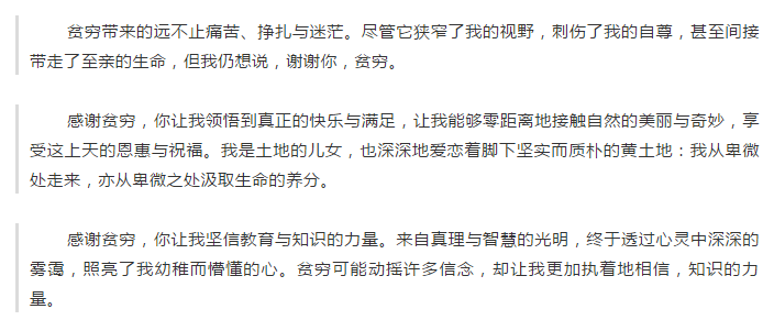 “貧窮帶來的遠(yuǎn)不止痛苦、掙扎與迷茫。盡管它狹窄了我的視野,刺傷了我的自尊,甚至間接帶走了至親的生命,但我仍想說,謝謝你,貧窮?!?/span>