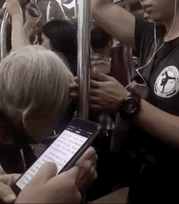 同樣是地鐵上,一個男孩怕老奶奶碰到頭,一直小心的用手擋著。