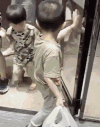 一個小男孩,看見有阿姨帶著孩子要進門,于是他趕緊跑過去。
