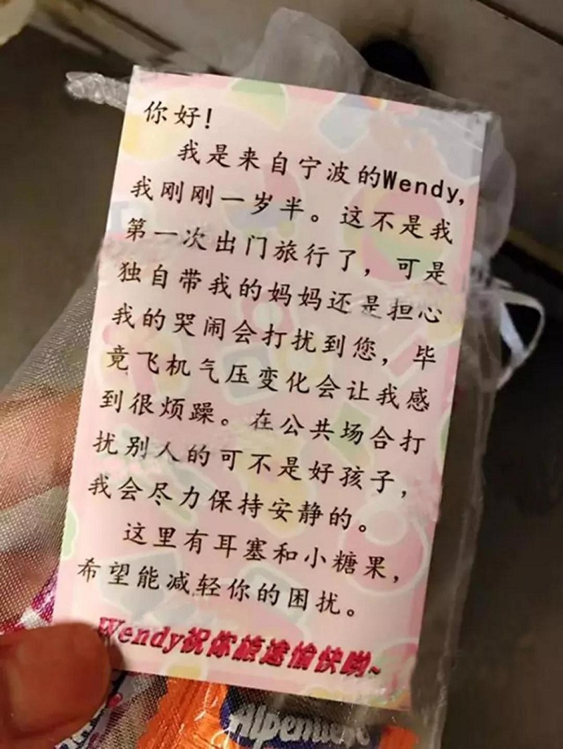 “我剛剛一歲半……獨自帶我的媽媽擔(dān)心我的哭鬧會打擾到您,這里有耳塞和小糖果,希望能減輕你的困擾……”