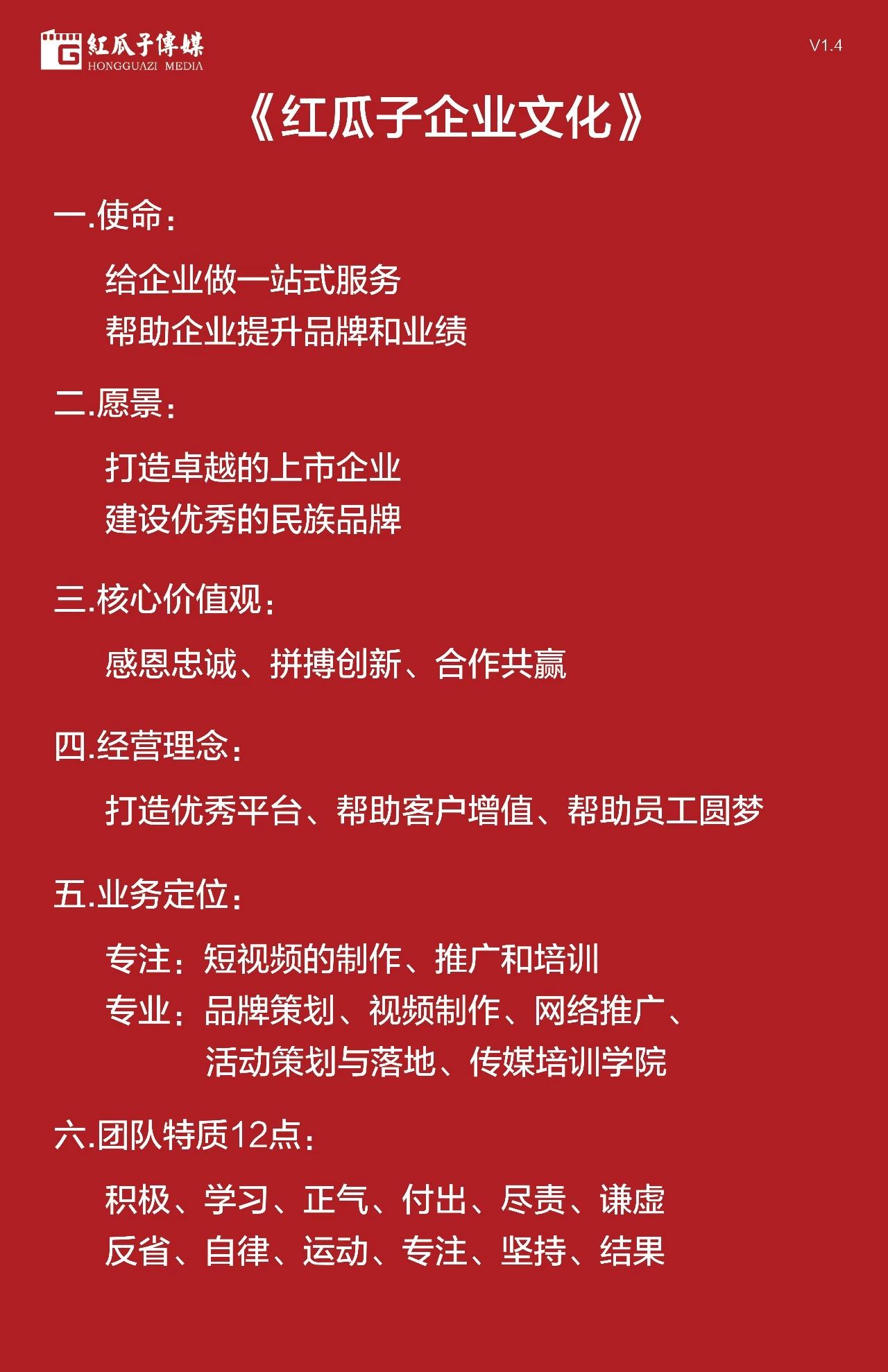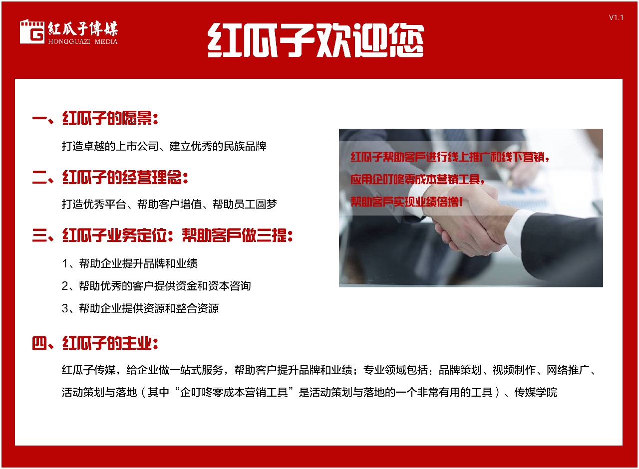 9、經(jīng)營理念:“打造優(yōu)秀平臺(tái),幫助客戶增值、幫助員工圓夢(mèng)”,這是寫在紅瓜子企業(yè)文化中的最重要的一條,未來的競爭是企業(yè)文化的競爭,企業(yè)文化對(duì)內(nèi)凝結(jié)人心,打造團(tuán)隊(duì),對(duì)外吸引客戶,組成同盟,現(xiàn)在已經(jīng)是營銷3.0時(shí)代,企業(yè)文化是優(yōu)秀供應(yīng)商評(píng)估的重要指標(biāo),紅瓜子企業(yè)文化的理念是打造優(yōu)秀平臺(tái),幫助客戶增值、幫助員工圓夢(mèng),客戶的認(rèn)同和體驗(yàn)感是紅瓜子最重要的追求