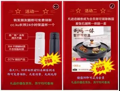 引流產(chǎn)品是,你轉(zhuǎn)發(fā)朋友圈即可免費(fèi)領(lǐng)取價值298元的保溫杯一個(限名額、時間)。開門產(chǎn)品是,凡是進(jìn)店顧客成為會員即可免費(fèi)領(lǐng)取價值968元的韓國麥?zhǔn)堜炭疽惑w鍋一套。