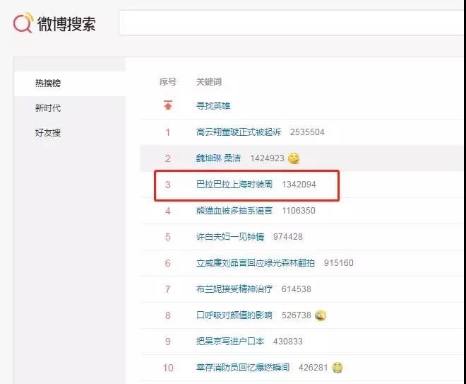巴拉巴拉上海時裝周還登頂微博熱搜第三