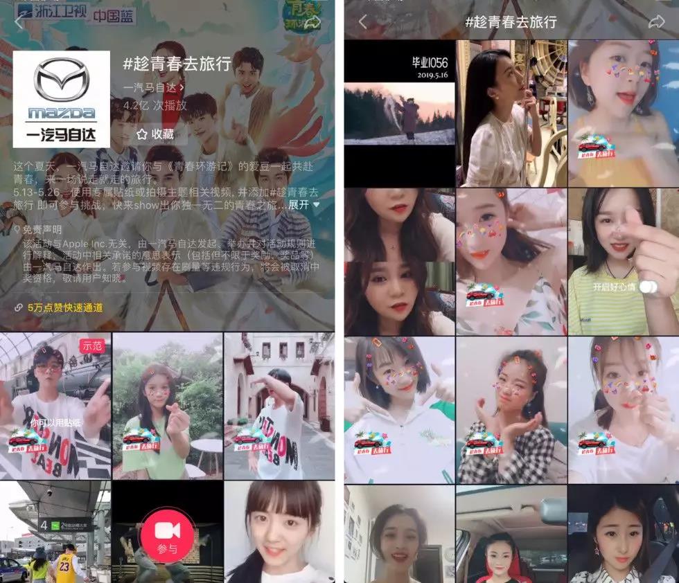 以一汽馬自達(dá)阿特茲&CX-4作為浙江衛(wèi)視《青春環(huán)游記》官方指定用車為契機(jī),5月13日-26日,一汽馬自達(dá)在抖音發(fā)起#趁青春去旅行 話題挑戰(zhàn)賽,用戶使用專屬貼紙或拍攝主題相關(guān)視頻,并添加#趁青春去旅行即可參與挑戰(zhàn)。兩周時(shí)間內(nèi),共計(jì)超過(guò)6萬(wàn)用戶創(chuàng)作了關(guān)于“青春&旅行”的短視頻,視頻播放量超過(guò)3億,視頻點(diǎn)贊量1000多萬(wàn),【一汽馬自達(dá)】品牌藍(lán)V賬號(hào)粉絲增至31.1萬(wàn)。此次雙方合作主要是針對(duì)年輕用戶群體深度傳遞一汽馬自達(dá)“趁青春去旅行”的品牌精神,獨(dú)有的個(gè)性和價(jià)值主張贏得了眾多忠實(shí)粉絲,建立了強(qiáng)烈的品牌認(rèn)同。