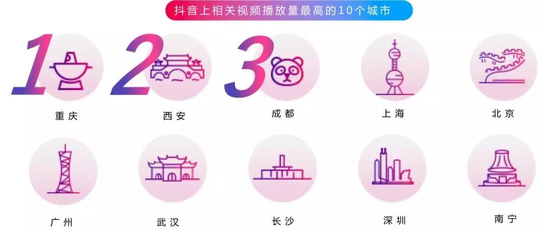 經(jīng)歷幾年時(shí)間的飛速發(fā)展后,短視頻APP抖音目前是各地打造城市名片的一個(gè)重要渠道。政務(wù)號(hào)、當(dāng)?shù)孛襟w入駐后發(fā)布的權(quán)威內(nèi)容,以及城市居民、游客自發(fā)分享的各類短視頻,共同構(gòu)建出一個(gè)與當(dāng)?shù)爻鞘邢嚓P(guān)的多元內(nèi)容池。而在全國(guó)所有城市中,成都的相關(guān)視頻播放量高居第三,說(shuō)明在巨量引擎生態(tài)中,成都有著巨大的營(yíng)銷潛力。