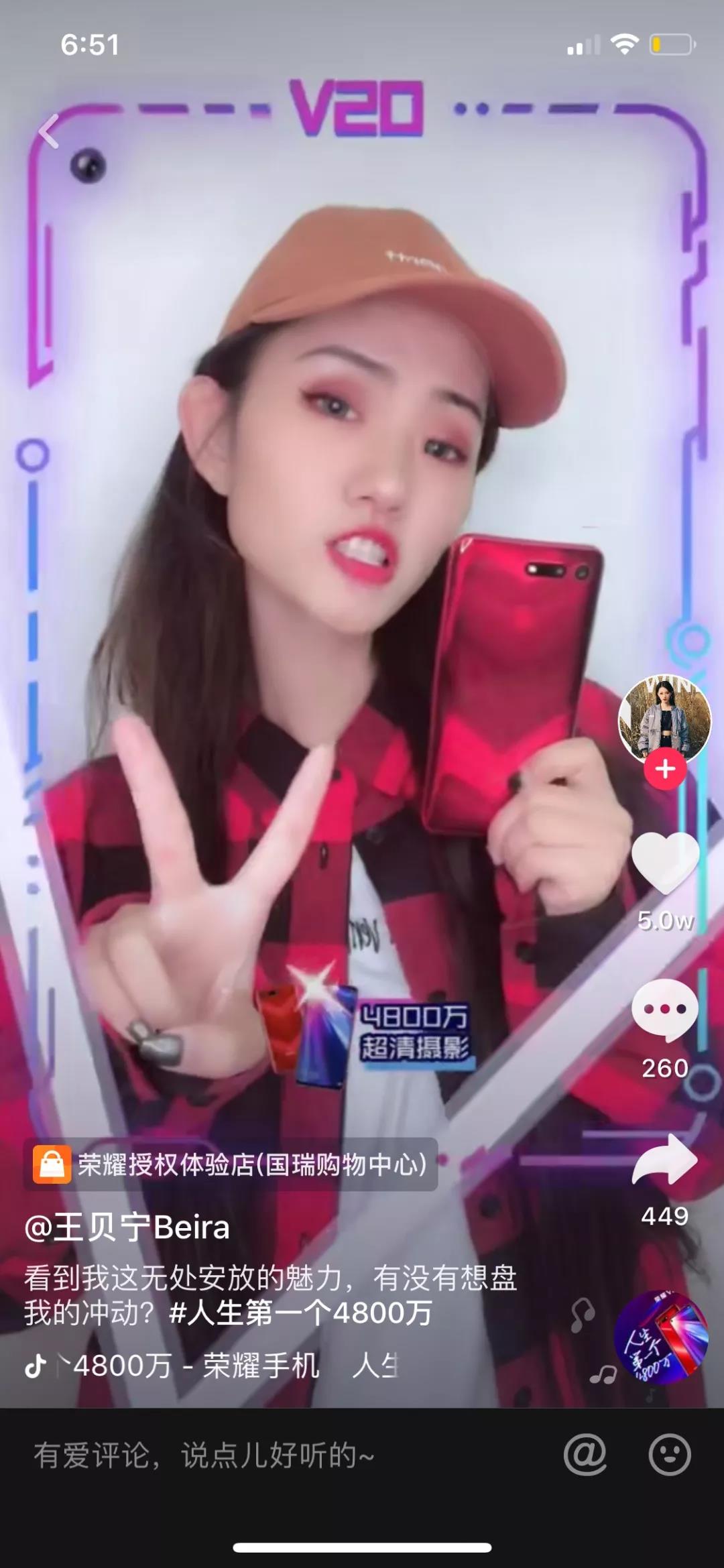 “從一無所有到第一個(gè)30萬真的很不容易”,常刷抖音的人對(duì)這個(gè)旁白一定不陌生。這個(gè)熱門BGM就像學(xué)貓叫、好嗨哦一樣,只要前奏響起來,每個(gè)人的腦海里都會(huì)自動(dòng)接上下一句。由此可見,一款熱門BGM對(duì)于視頻傳播的幫助極大?;趯?duì)平臺(tái)玩法的爛熟于心,榮耀手機(jī)此次的挑戰(zhàn)賽,巧妙改編了抖音“第一個(gè)30萬”熱門BGM,在2400萬后融入4800萬,并配合視頻反轉(zhuǎn)為清晰美型的畫面。V20的4800萬超清攝像功能伴隨著入耳的BGM,成為膾炙人口的產(chǎn)品slogan