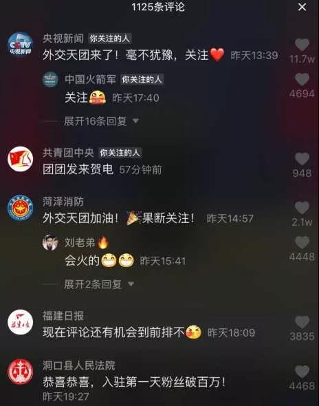 值得注意的是,在“外交部發(fā)言人辦公室”賬號入駐抖音的第一天,@央視新聞、共青團中央等各個媒體紛紛前來道賀!