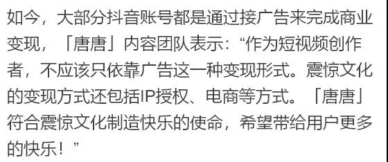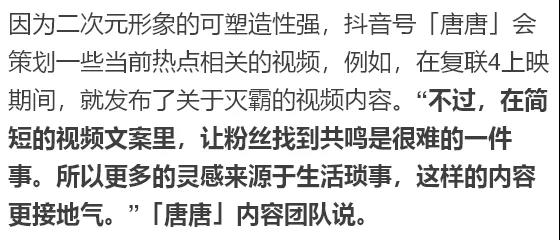 「唐唐」內(nèi)容團(tuán)隊(duì)說(shuō):“今年1月份才入駐抖音,最初其實(shí)是純粹想吐槽,沒(méi)想到一下就火了??吹绞袌?chǎng)熱度很好,我們就接著繼續(xù)做了下去。”