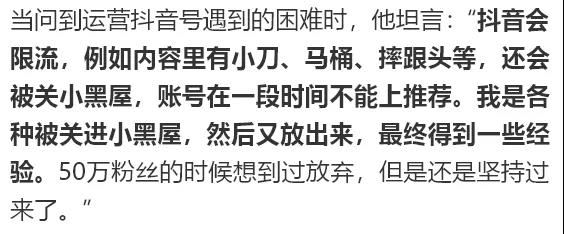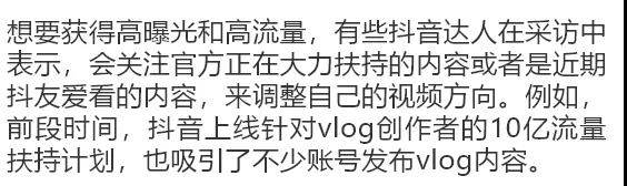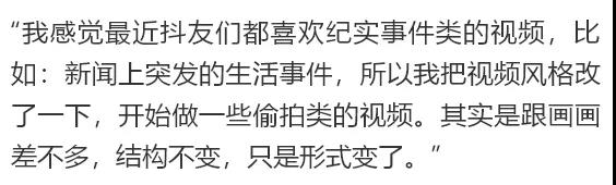 對(duì)此,不少抖音達(dá)人都提到幾點(diǎn),一是優(yōu)質(zhì)內(nèi)容,做能引發(fā)觀眾共鳴的視頻;二是多做系列視頻,給觀眾一定的期待;三是會(huì)根據(jù)粉絲的喜好,調(diào)整自己的視頻方向。