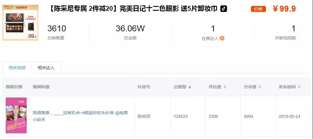 最后,陳采尼一條視頻獲贊12萬,售出3600件,銷售額36萬。