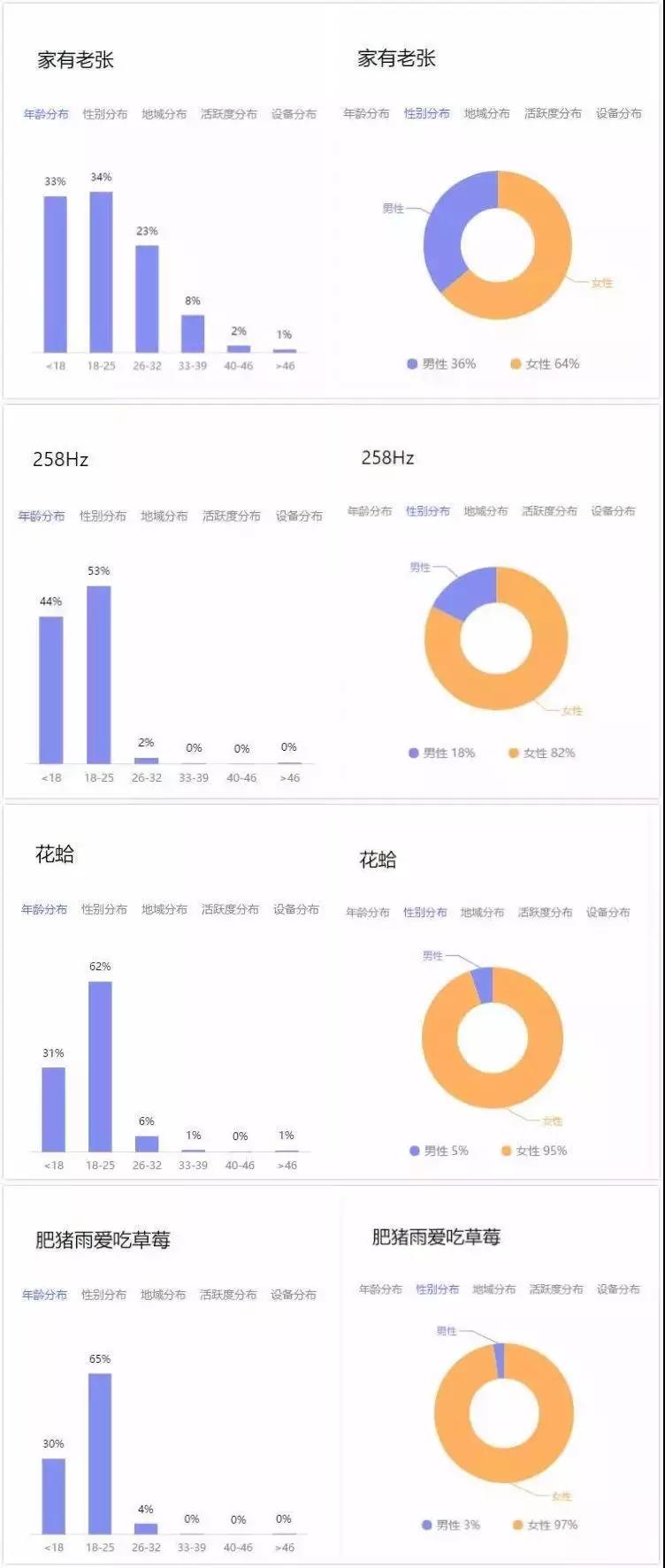 但他們都有一個共同點:關(guān)注這些賬號的用戶大多都是18-25女性——這也是完美日記的目標(biāo)用戶的典型特征。
