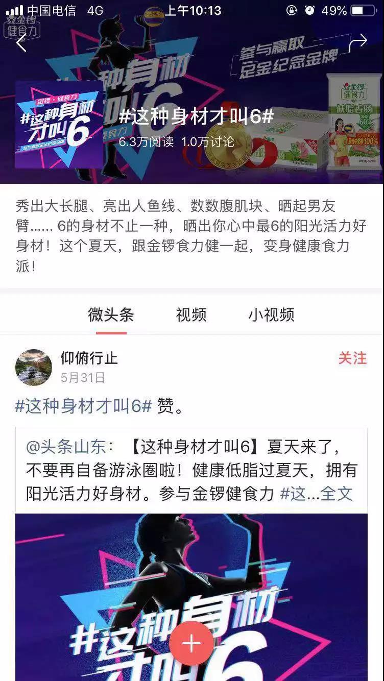 另一方面,金鑼聯(lián)動今日頭條、火山小視頻多維分發(fā)傳播,為品牌宣傳加碼。其中,今日頭條在站內(nèi)置頂發(fā)起#這種身材才叫6#挑戰(zhàn)賽同名微話題強勢導流,并設(shè)置有獎互動活動激發(fā)用戶的參與熱情,引發(fā)眾多KOL和普通用戶曬起健康好身材。抖音則借助開屏硬廣、發(fā)現(xiàn)頁、dou+、非標硬廣等強勢資源曝光,實現(xiàn)廣告精準觸達400W目標受眾。