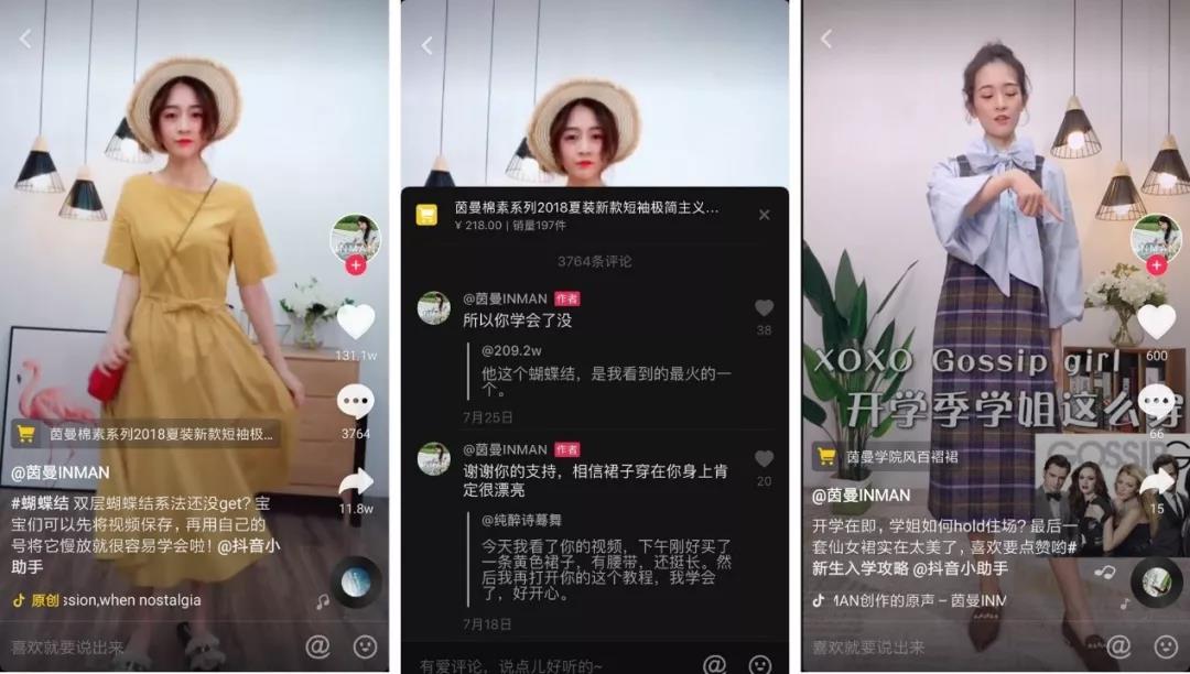 實用技巧類內(nèi)容,讓用戶在學習中“種草”商品。模特身穿茵曼品牌服裝,通過發(fā)一些蝴蝶結(jié)系法、鞋帶系法、領(lǐng)結(jié)教程、絲巾玩法等服飾相關(guān)教程,吸引用戶在學習技巧過程中,對展示的單品產(chǎn)生購買興趣。同時,實用技巧類視頻的互動作用更為明顯,如茵曼品牌主頁中一條超過131w贊的爆款視頻是教如何打雙層蝴蝶結(jié)的視頻,評論里出現(xiàn)很多關(guān)于系法的詢問和互動,以及求裙子購買鏈接的評價,利于粉絲的積累。除服裝類的技巧展示外,鑒于茵曼是女裝品牌,日常運營中還會發(fā)布一些專門針對女性用戶的話題,如如何拍照更顯腿長、如何擺pose等拍照教程視頻。