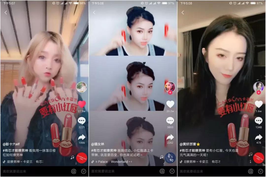 憑此亮眼數(shù)據(jù),卡姿蘭#有芯才能撩男神#挑戰(zhàn)賽強勢占據(jù)美妝行業(yè)商業(yè)化挑戰(zhàn)賽第一名?!靶〖t唇”唇膏一夜爆紅,成為新一代抖音好物。