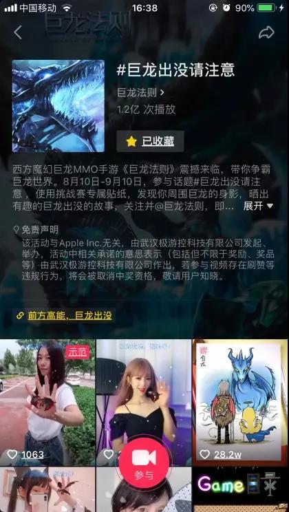 挑戰(zhàn)賽是抖音為各類品牌獨(dú)家定制的高品質(zhì)話題活動(dòng)。我們注意到,8月10日上線的《巨龍法則》手游挑戰(zhàn)賽,3天內(nèi)視頻播放次數(shù)就過億。同時(shí),抖音用戶還貢獻(xiàn)出將近400個(gè)原創(chuàng)視頻。并且,這個(gè)數(shù)據(jù)還在不斷的攀升,一個(gè)刷屏級(jí)的營(yíng)銷案例或許正在產(chǎn)生。