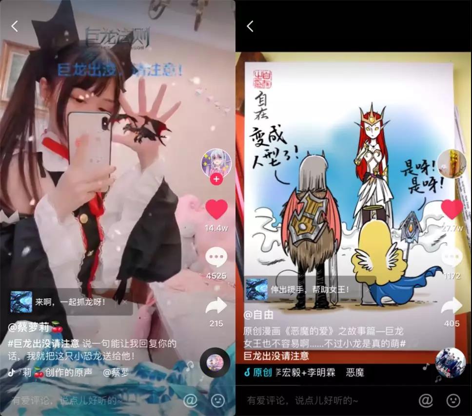 不難發(fā)現(xiàn),單看《巨龍法則》這一次的抖音挑戰(zhàn)賽,有不少頂級(jí)流量達(dá)人參與到挑戰(zhàn)賽的活動(dòng)當(dāng)中,例如蔡蘿莉、呼叫網(wǎng)管、自由等等。游戲廠商通過在星圖給達(dá)人下單,組建泛娛樂達(dá)人與垂類達(dá)人團(tuán),從游戲產(chǎn)品的世界觀劇情、主要人物、玩法特色、配音等多維度創(chuàng)作內(nèi)容,打造內(nèi)容營(yíng)銷矩陣,擴(kuò)大品牌輻射范圍。并通過達(dá)人團(tuán)的引導(dǎo),讓抖音用戶跟隨他們產(chǎn)出視頻,催生游戲內(nèi)容的爆發(fā)。