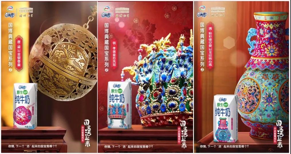 中國(guó)國(guó)家博物館作為中國(guó)優(yōu)秀傳統(tǒng)文化的聚合體,在當(dāng)下,對(duì)于傳統(tǒng)文化的傳承與發(fā)展已經(jīng)不能僅僅局限于博物館這樣的概念,而是將這些珍貴的傳統(tǒng)文化以一種泛娛樂化的方式傳遞給大眾,尤其是兒童群體。伊利QQ星以助力中國(guó)孩子智慧成長(zhǎng)的理念發(fā)起本次與國(guó)寶的跨界合作,讓每一包牛奶都成為文化傳播的載體。沖破包裝視覺的改變和創(chuàng)新是跨界合作的最基礎(chǔ)最原始的利益層,透過基礎(chǔ)的視覺創(chuàng)新,本次伊利QQ星與中國(guó)國(guó)家博物館的跨界合作更是將核心利益層進(jìn)行延伸,讓消費(fèi)者通過購(gòu)買產(chǎn)品到達(dá)精神表達(dá)、文化表達(dá)、以及趣味互動(dòng)。融入故事性、AR互動(dòng)、社交平臺(tái)分發(fā)等創(chuàng)新點(diǎn),區(qū)別于以往只停留在視覺創(chuàng)新上的泛泛合作。品牌篩選了中國(guó)國(guó)家博物館中具有高大眾熟悉度的幾件國(guó)寶,唐代鎏金香囊、雁魚青銅紅燈、粉彩鏤空轉(zhuǎn)心瓶和孝端皇后的鳳冠定制成國(guó)博典藏國(guó)寶系列瓶,并在每包牛奶的國(guó)寶圖案中附上了AR功能,打開支付寶掃描出動(dòng)效講出對(duì)應(yīng)的歷史故事,讓產(chǎn)品本身就成為一個(gè)行走的博物館,將伊利QQ星助力孩子智慧成長(zhǎng)的理念集中在產(chǎn)品的視覺設(shè)計(jì)理念中進(jìn)行傳播。