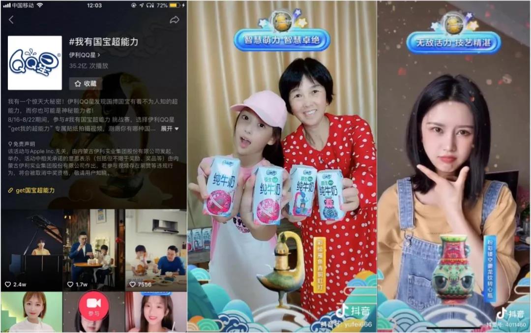 緊接著8月16日,伊利QQ星在抖音發(fā)起#我有國(guó)寶超能力#為話題的挑戰(zhàn)賽,參與者通過掃描臉部出現(xiàn)匹配的不同的文物, 分別對(duì)應(yīng)無敵活力、神仙顏力、智慧萌力,出現(xiàn)品牌專屬場(chǎng)景AR貼紙,讓有效曝光與創(chuàng)意場(chǎng)景進(jìn)行結(jié)合。多位KOL參與挑戰(zhàn)賽也調(diào)動(dòng)了UGC視頻參與率,截止到8月25日,參與挑戰(zhàn)賽人數(shù)達(dá)36萬以上,貼紙播放量到達(dá)1700萬,挑戰(zhàn)賽播放已達(dá)到35億次。