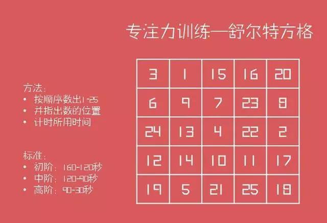 嘗試一下針對某件事進行冥想。在冥想的過程中,我們很容易想到其他的事情,這時我們就要有意識地提醒自己,要專注思考這件事?;蛘咄ㄟ^“舒爾特方格”(如下圖)去練習(xí),提升你的專注力。