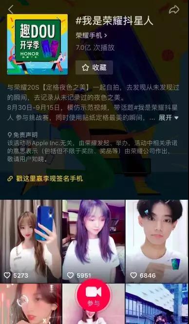 其中,#開學(xué)我是實力派#、#開學(xué)我是偶像派#兩個挑戰(zhàn)賽以素人自主創(chuàng)作為主,結(jié)合年輕人關(guān)注“顏值”與“技能”的點,同時融入榮耀20S的3200萬人像超級夜景、4800萬超廣角AI三攝功能,充分釋放出學(xué)生的創(chuàng)作天賦。從與開學(xué)相關(guān)的假期作業(yè)、心態(tài)變化,到開學(xué)之后,課堂、軍訓(xùn)、寢室、運動等極具青春色調(diào)的方方面面內(nèi)容,都以第一視角,將年輕人的小世界、校園里最真實的狀態(tài)展現(xiàn)在屏幕里。最終,兩個話題下的視頻內(nèi)容,在學(xué)生的自主傳遞下實現(xiàn)了近5億的播放量。