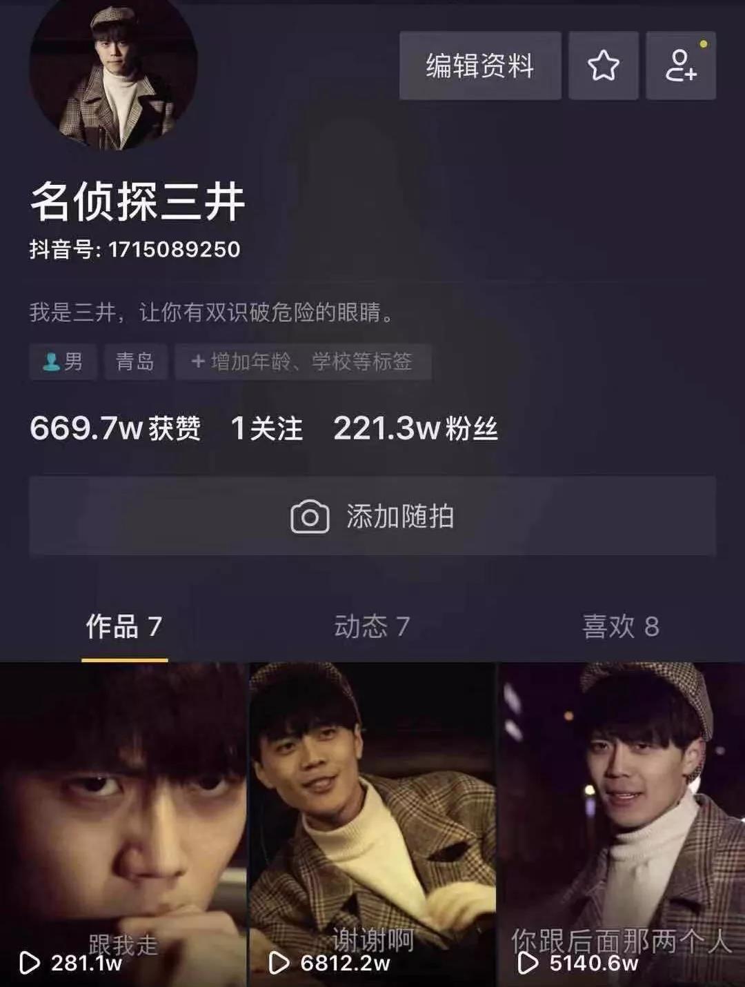 「名偵探三井」現(xiàn)已對外發(fā)布3條視頻,抖音粉絲數(shù)達(dá)221萬,單條視頻播放量最高達(dá)6812萬,講的是男生在網(wǎng)吧不要吃陌生人給的東西,因?yàn)橛锌赡苁且蕾囆退幤贰?/span>