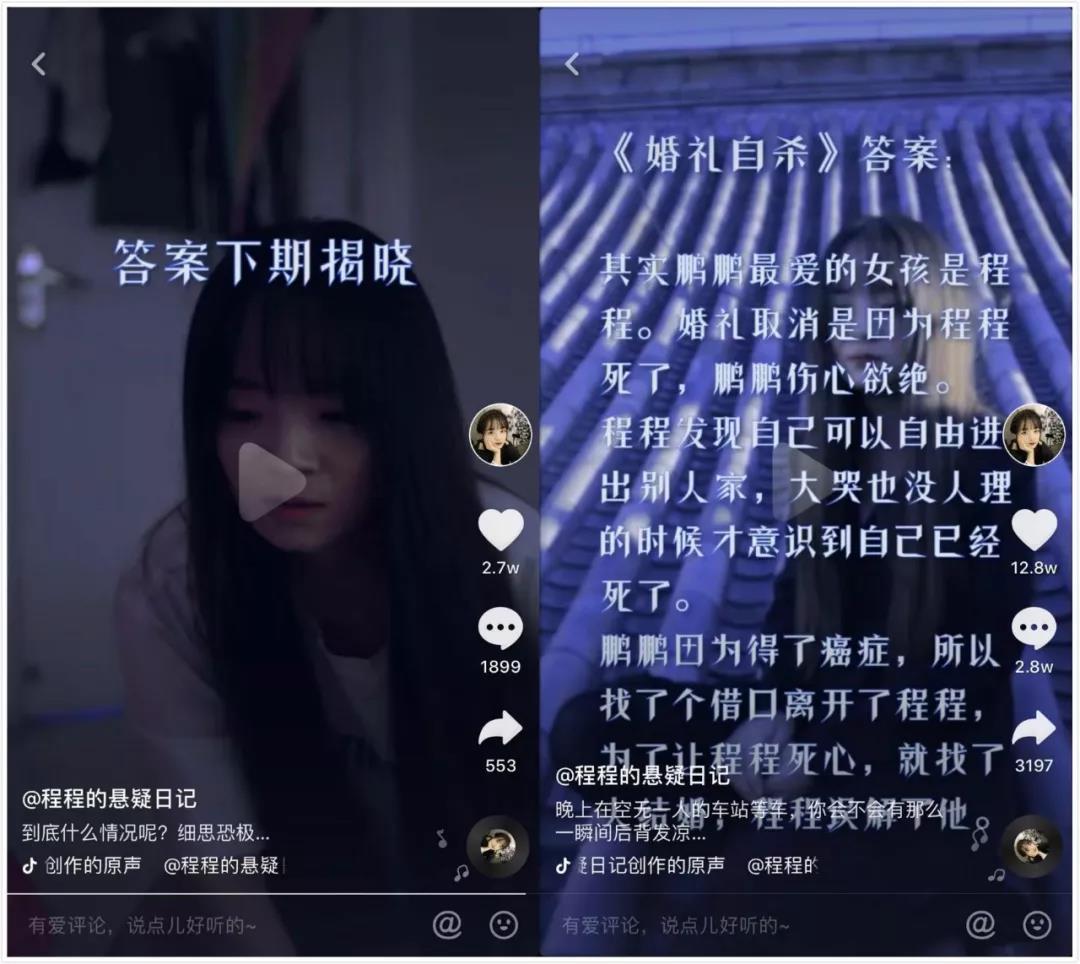 由于抖音對視頻的時(shí)間限制,以及視頻播放量和完播率對抖音流量推薦的影響,「程程的懸疑日記」等懸疑類賬號會通過在視頻結(jié)尾提醒推理答案在下期視頻結(jié)尾,由此提高視頻點(diǎn)擊量和完播率,讓觀眾有“在抖音看豎屏連續(xù)劇”的感覺。